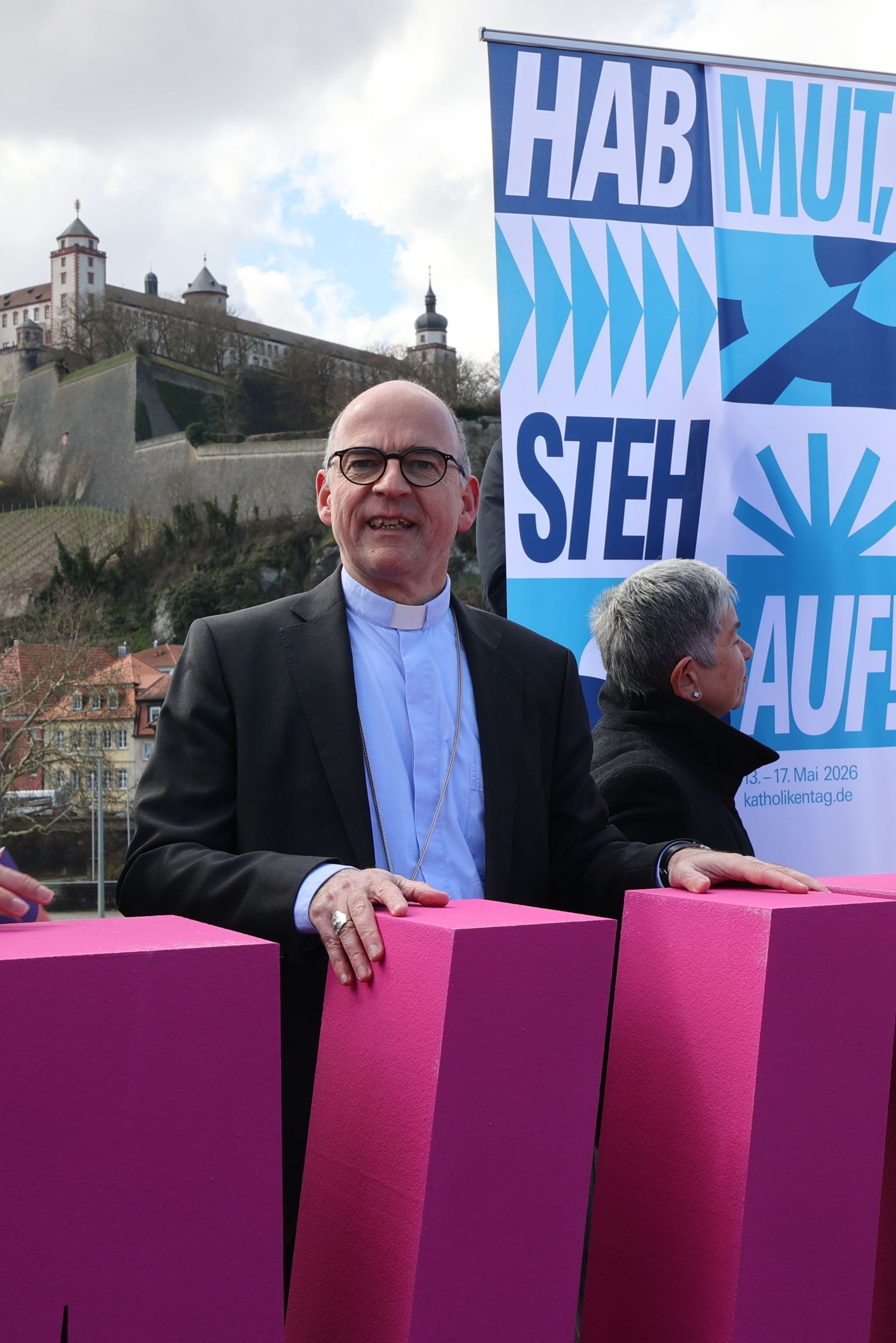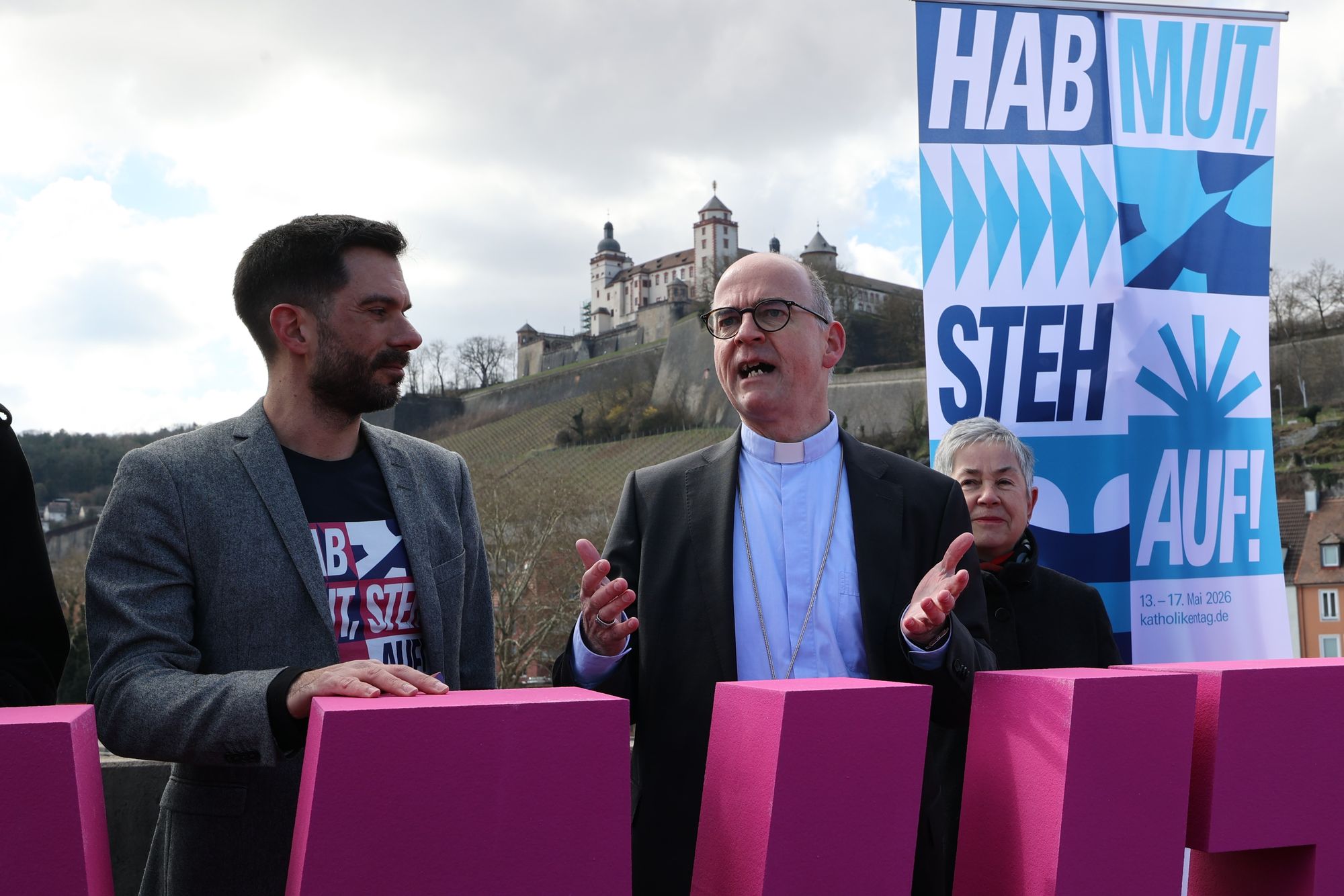 „Hier in Würzburg wollen wir mutig und beherzt Zeugnis für unseren Glauben ablegen“, sagte Bischof Dr. Franz Jung. „Denn er schenkt uns eine Haltung der Zuversicht, der Hoffnung und der Verbundenheit.“ Die eigens für Würzburg neu eingeführten Icons der Werbelinie zeigten „prägnant besondere Eigenschaften unserer Stadt und des Katholikentags 2026: Der Fränkische Rechen verweist auf unsere Region, die Alte Mainbrücke ist ein bedeutendes Wahrzeichen, der aufsteigende Vogel symbolisiert den Mut. Heute, am Saint Patrick’s Day, sticht aber besonders das Irische Kreuz hervor. Es verweist auf unsere Glaubenswurzeln in der Mission der Heiligen Kilian, Kolonat und Totnan. ‚Hab Mut, steh auf!‘ war im besten Sinne ihr Lebensmotto. Um des Himmelreichs willen haben sie alles aufgegeben, um hier in Franken – auch gegen Widerstände – die Frohe Botschaft zu verkünden. Es ist gut, dass der Katholikentag diese Erinnerung wachhält und somit auch uns zum Zeugnis aufruft.“