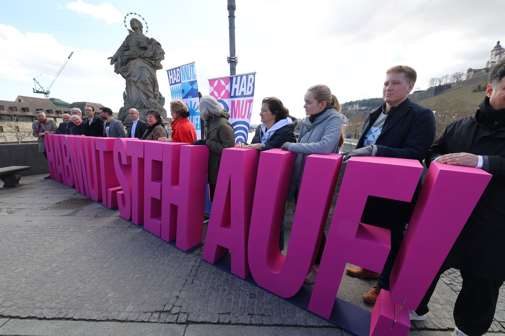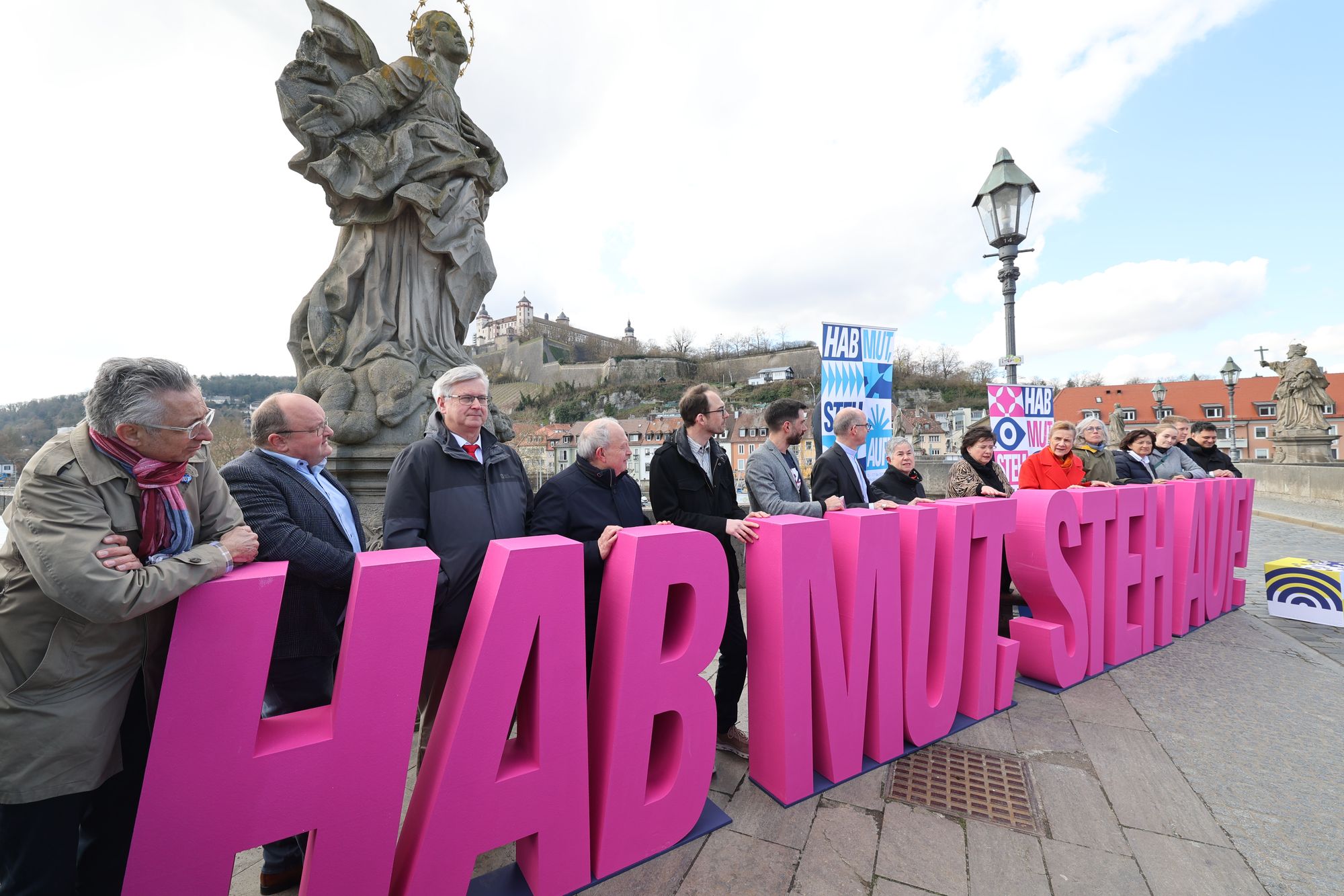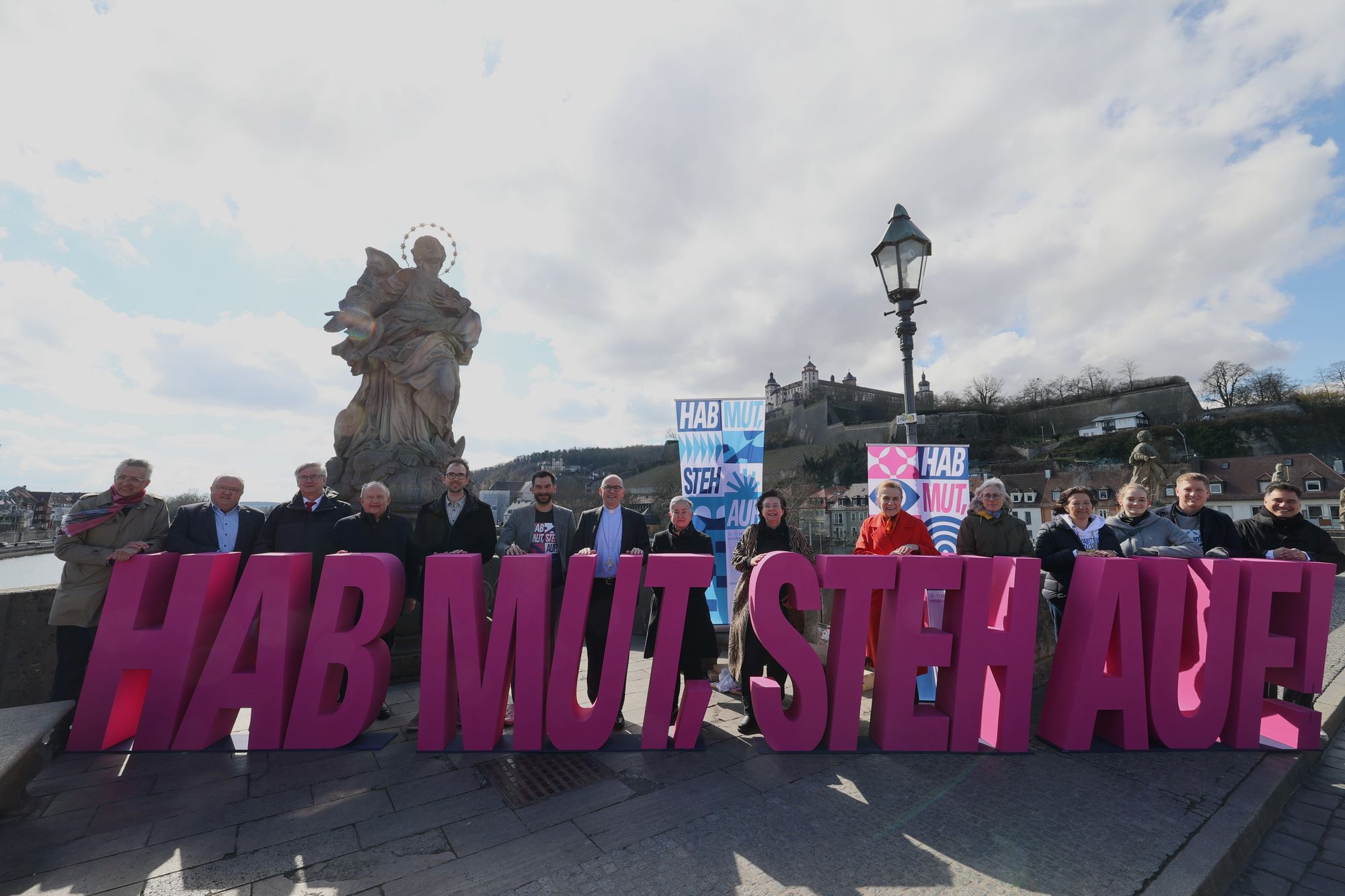 Würzburg (POW) Mit einer Präsentation auf der Alten Mainbrücke in Würzburg ist heute die Werbelinie für den 104. Deutschen Katholikentag 2026 vorgestellt worden. Das Leitwort „Hab Mut, steh auf!“ wurde in 1,20 Meter hohen, farbigen Lettern gezeigt. „Aufstehen, damit sich etwas verändert! Das ist wichtig“, sagte die Präsidentin des Zentralkomitees der deutschen Katholiken (ZdK) und Vorsitzende der Katholikentagsleitung, Dr. Irme Stetter-Karp. „So wie es Bartimäus im Markusevangelium tut. Er wird von seiner Blindheit geheilt, weil er sich traut, seine Stimme zu erheben.“