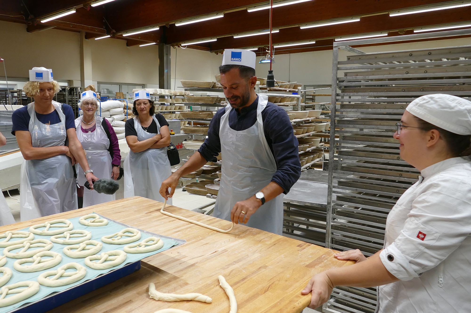 Los ging die Tour am frühen Morgen in Mainaschaff. Um 6.30 Uhr führte Bäckermeisterin Veronika Hench die Besucher durch die Bäckerei Hench und beantwortete Fragen zur Situation ihres Handwerks. Dazu gehörten auch Energiekosten, Fachkräftemangel und Menschen aus fünf verschiedenen Nationen, die hier zusammenarbeiten. Frings durfte sich in der Kunst des Brezelformens üben. Das Ergebnis konnte sich sehen lassen.