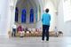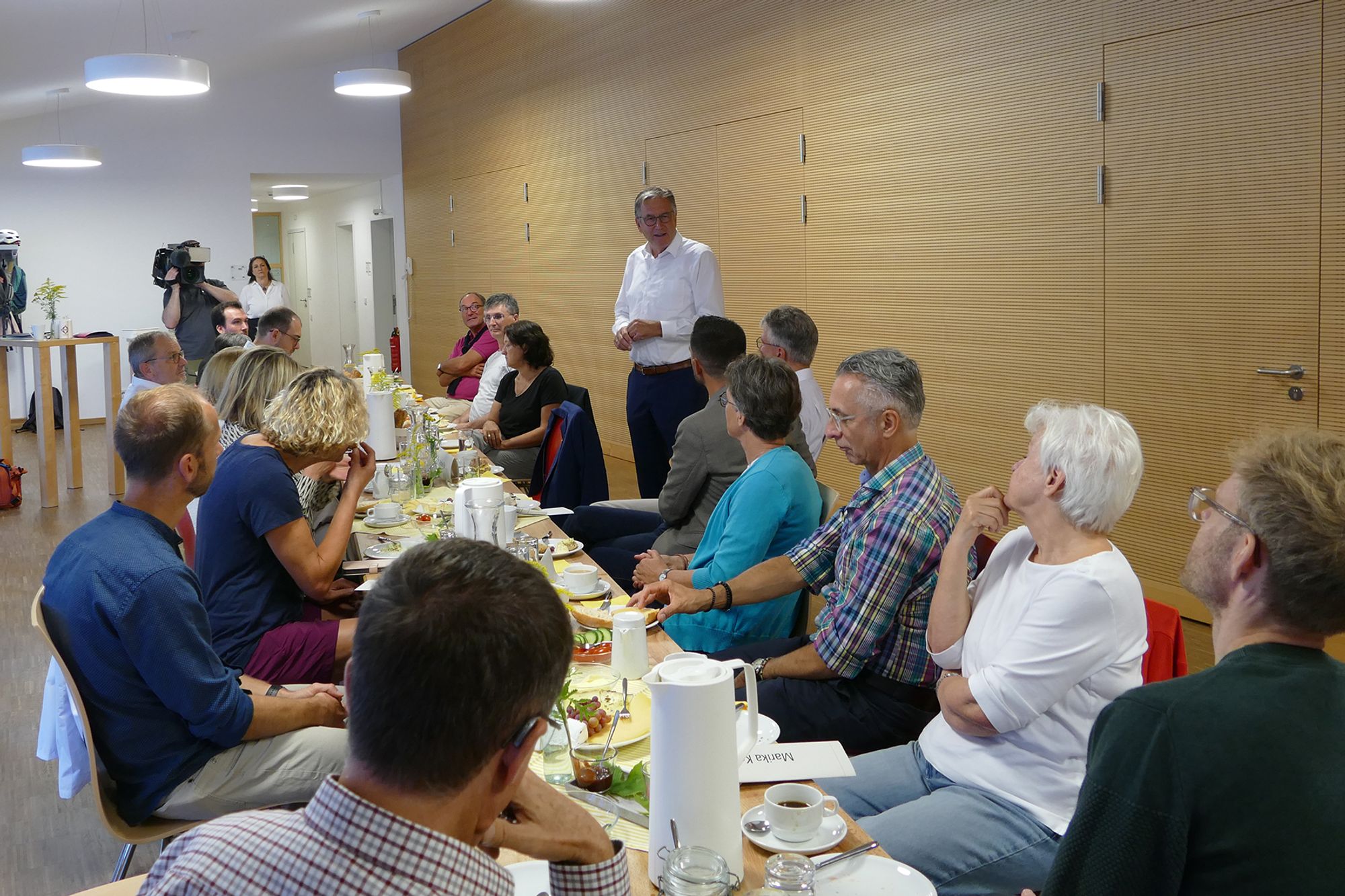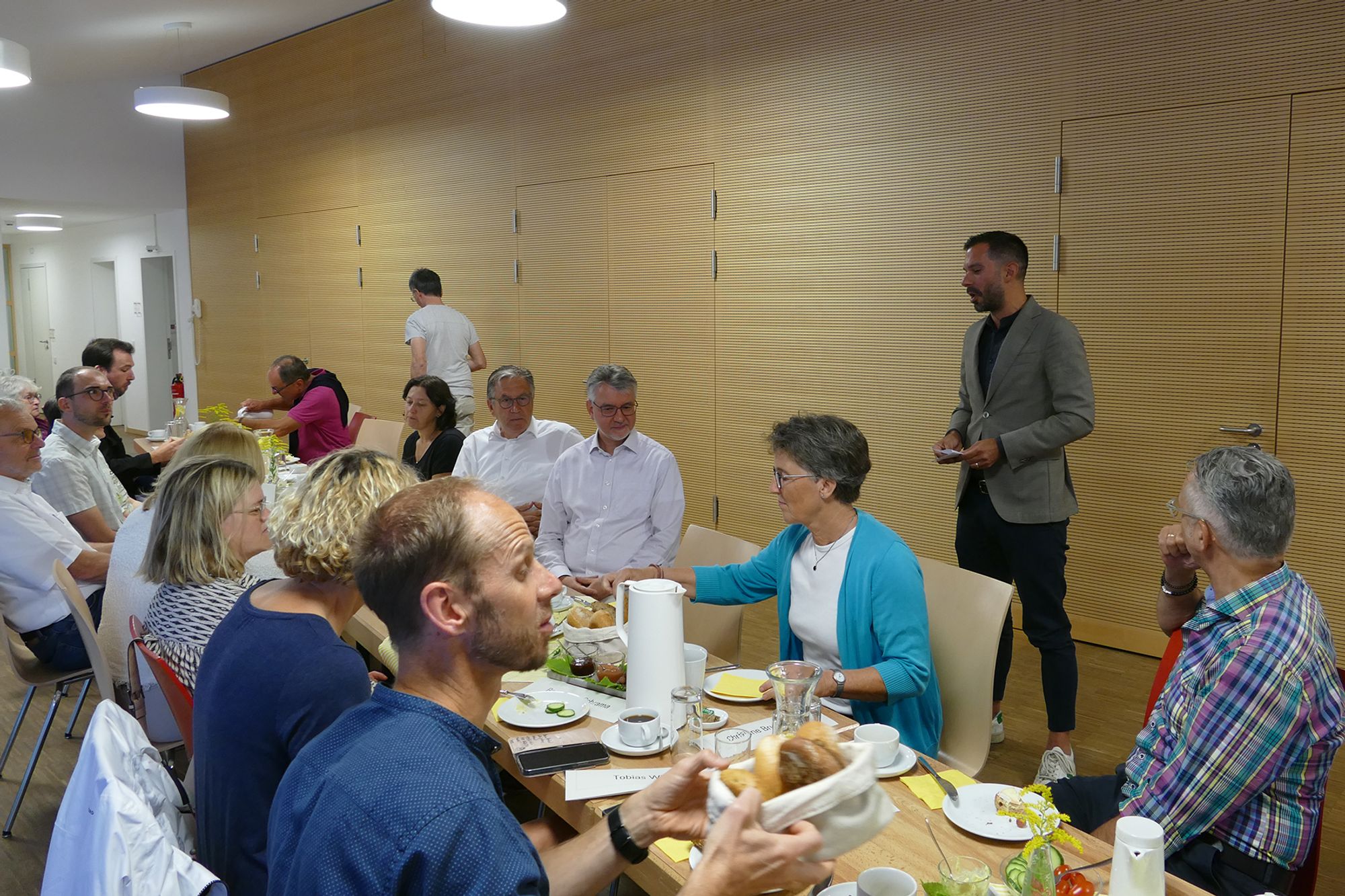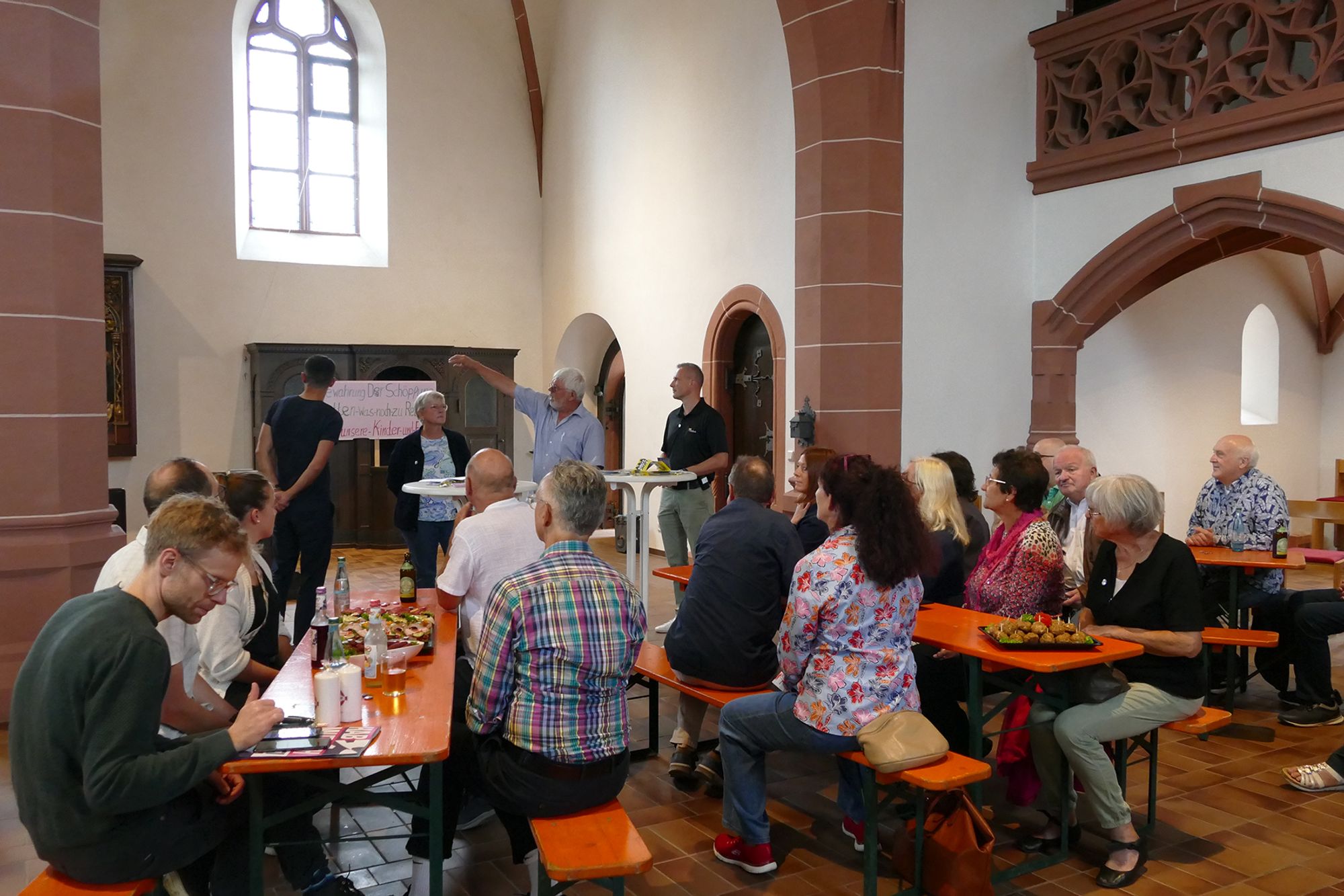 Mit einem Korb voller frischer Brötchen brach die Gruppe dann auf zum etwa zehn Kilometer entfernt liegenden Aschaffenburger Stadtteil Schweinheim. Im Pfarrzentrum Mariä Geburt waren die Tische gerichtet für ein gemeinsames Frühstück. Die Gemeinde dort hat passend zu der vom Architekten und Künstler Leo Zogmayer gestalteten Kirche eine besondere Form der Liturgie entwickelt. Christine Brumhard, Vorsitzende des Gemeindeteams, und weitere Mitglieder aus dem Team gaben den Besuchern eine Einführung in den Kirchenraum, der nach dem Prinzip der ästhetischen Reduktion gestaltet ist. Der Raum vermittele Licht, Weite und Geborgenheit und führe nach innen, sagte Brumhard. Im Gespräch wurde deutlich, dass das nach der Pensionierung des Pfarrers im vergangenen Jahr jetzt fast komplett auf ehrenamtlichem Engagement beruhende Gemeindeleben lebendig geblieben ist.